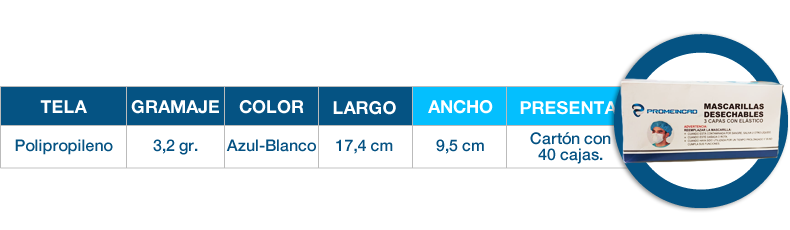 CONCEPTO: Mascarilla desechable, elaborado en tela no tejida de polipropileno, con elástico de sujeción.